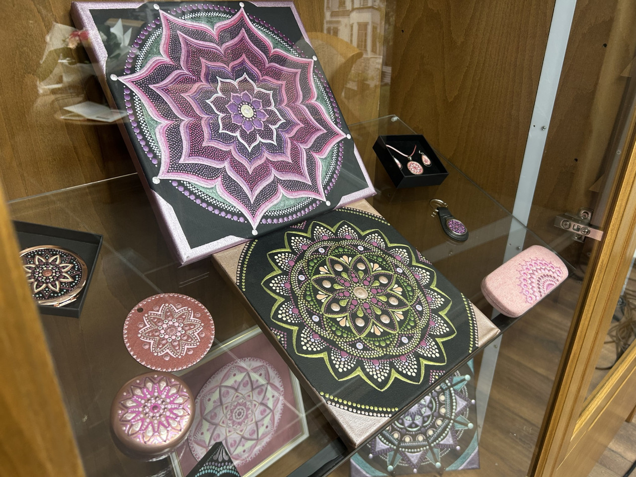 A látogatók mandalafestményekben, ékszerekben, díszdobozokban, pénztárcákbam, sminktükrökben, kulcstartókbam, szemüvegtokokban és csészékben is gyönyörködhetnek