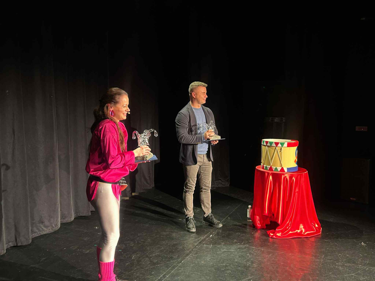 A képeken látható: Kirják Róbert, a VIDOR Fesztivált szervező Móricz Zsigmond Színház igazgatója; Botos Éva, Colombina-díjas színművész, a díjazott előadás szereplője.
