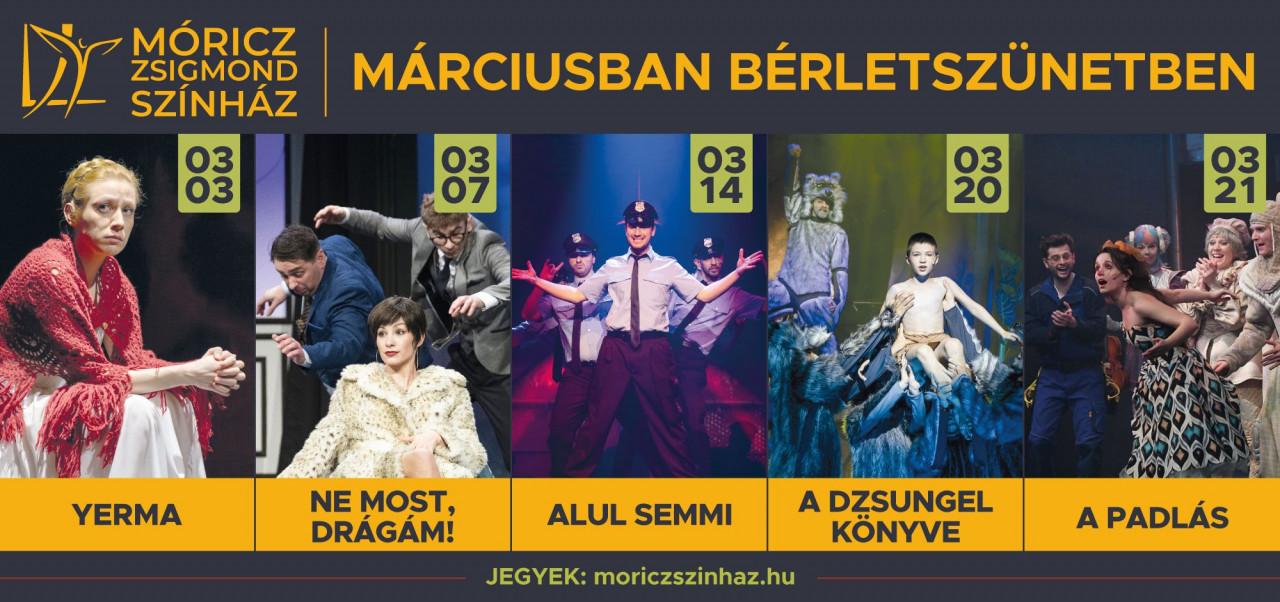 A bérletszünetes előadások sorát március 3-án Federico García Lorca Yerma című műve nyitja a Krúdy Kamarában. Március 7-én a könnyed humor kedvelőit várja a Ne most, drágám!, majd március 14-én az Alul semmi kerül színre a Nagyszínpadon. Március 20-án a családok számára kínál felejthetetlen élményt A dzsungel könyve, míg március 21-én Presser Gábor és Sztevanovity Dusán ikonikus musicalje, A padlás zárja a hónap bérletszünetes előadásait.