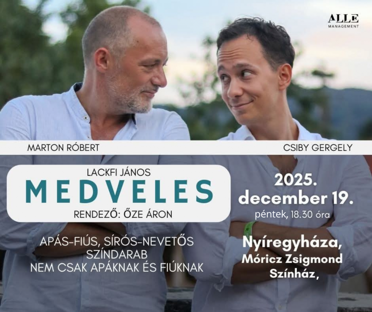 Lackfi János Medveles című darabját Őze Áron rendezésében, Csibi Gergely és Marton Róbert szereplésével láthatja a közönség, a Szindbád Rendezvényteremben 2025. december 19-én, pénteken 18:30-kor. Muszáj-e a fiúnak az apa útját követni? Muszáj-e az apának a fiút irányítani?, miközben Mindezt nehéz medvelesen megbeszélni. Ott csak suttogni lehet. Nehogy elriasszák az állatot. Amely az erdőben lakik? Amely bennük lakik? Amely rájuk les?
