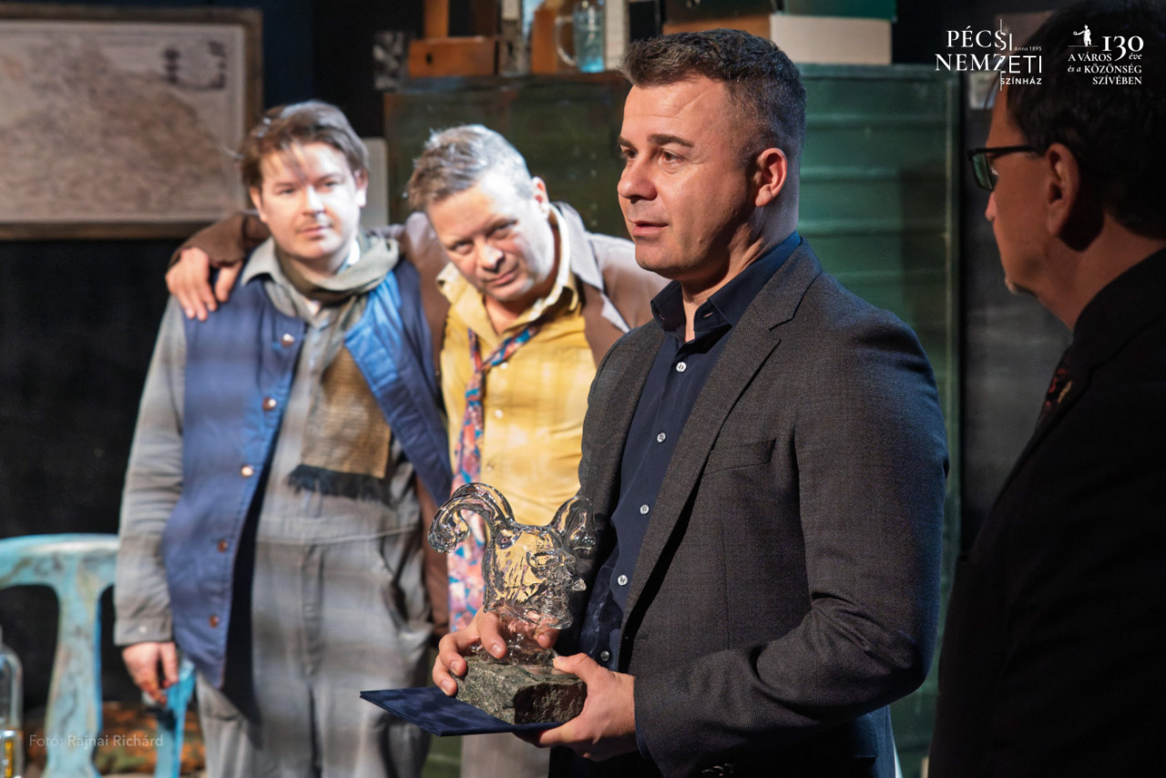 A képen látható balról jobbra: Kirják Róbert, a VIDOR Fesztivált szervező Móricz Zsigmond Színház igazgatója; Köles Ferenc, Arlecchino-díjas színművész; Füsti Molnár Éva Jászai Mari-díjas színművész, a díjazott előadás rendezője; Lipics Zsolt, a Pécsi Nemzeti Színház igazgatója; Katona Levente színművész, a díjazott előadás szereplője